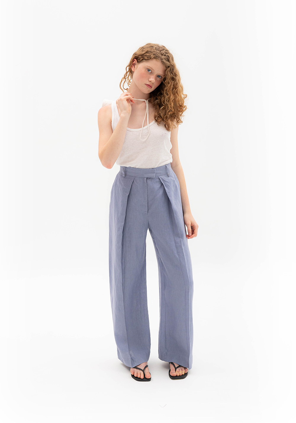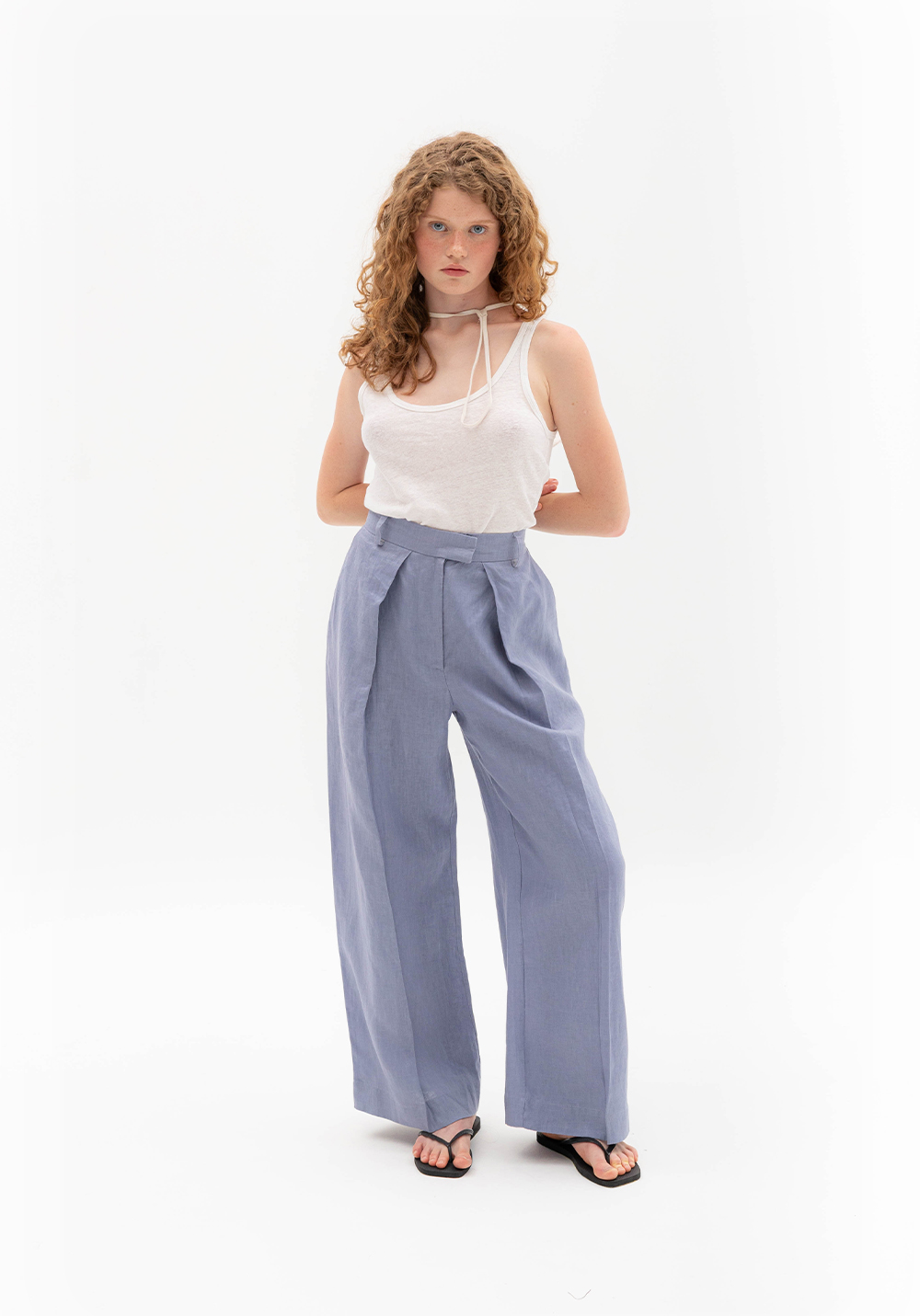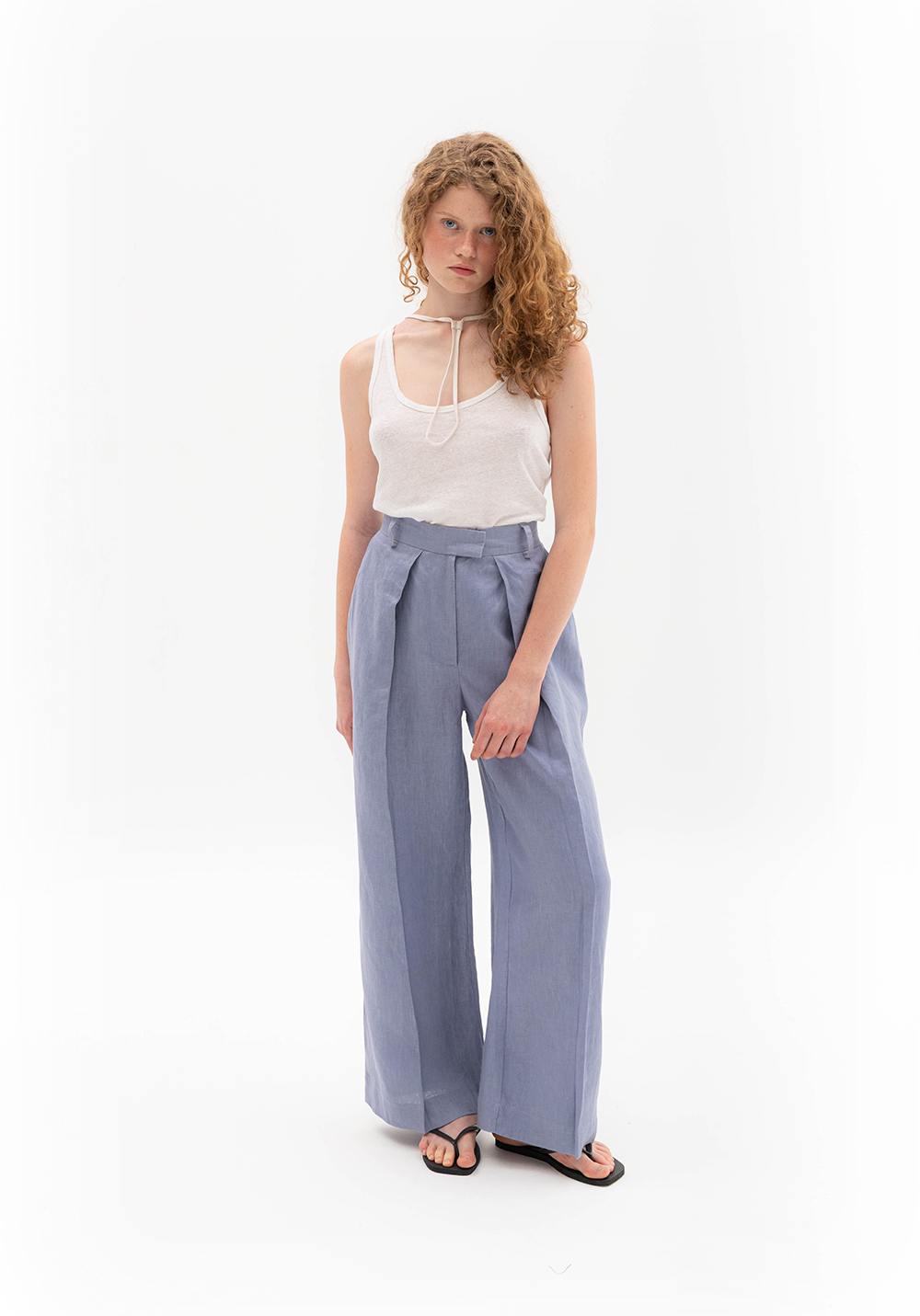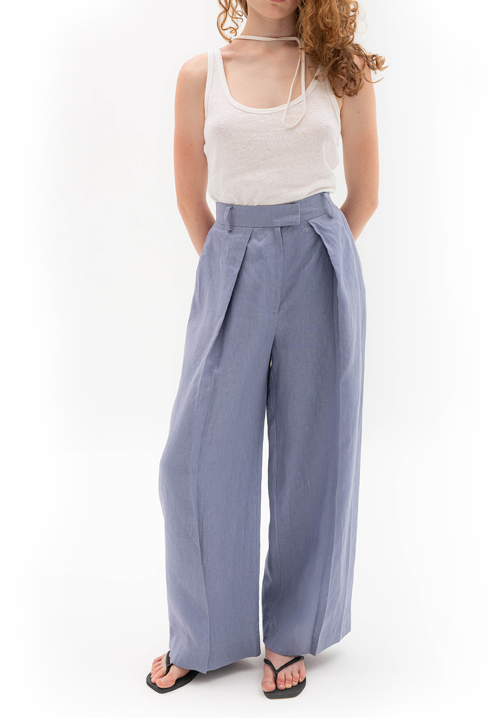 Брюки з глибокими складами сіро-волошкового кольору, вільного крою. Мають бокові та задні кишені, пояс зі шльвками. Виконані зі 100% щільного льону.