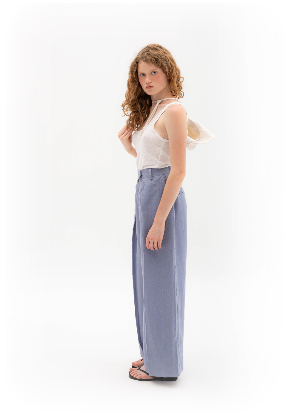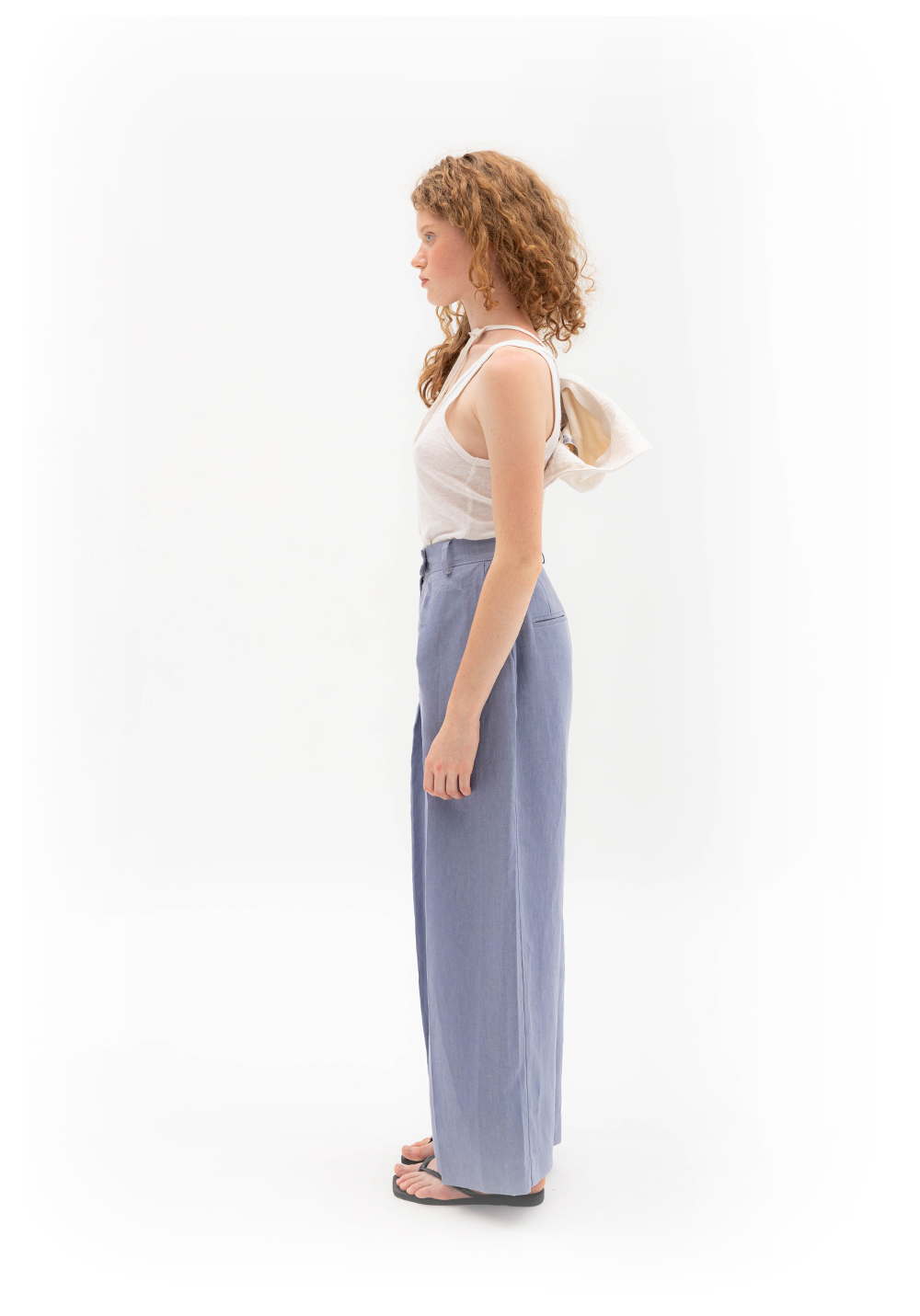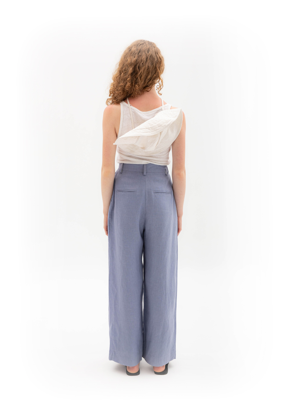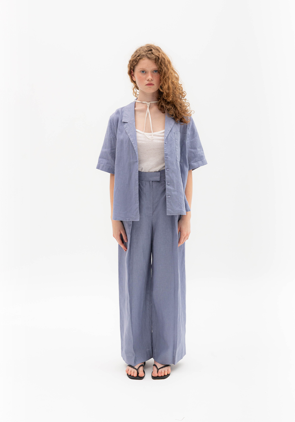 Брюки з глибокими складами сіро-волошкового кольору, вільного крою. Мають бокові та задні кишені, пояс зі шльвками. Виконані зі 100% щільного льону.