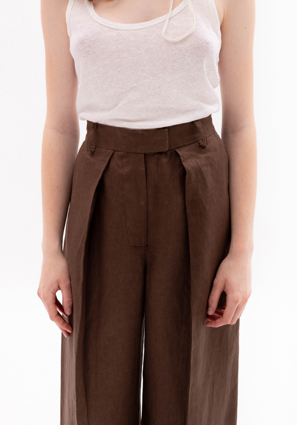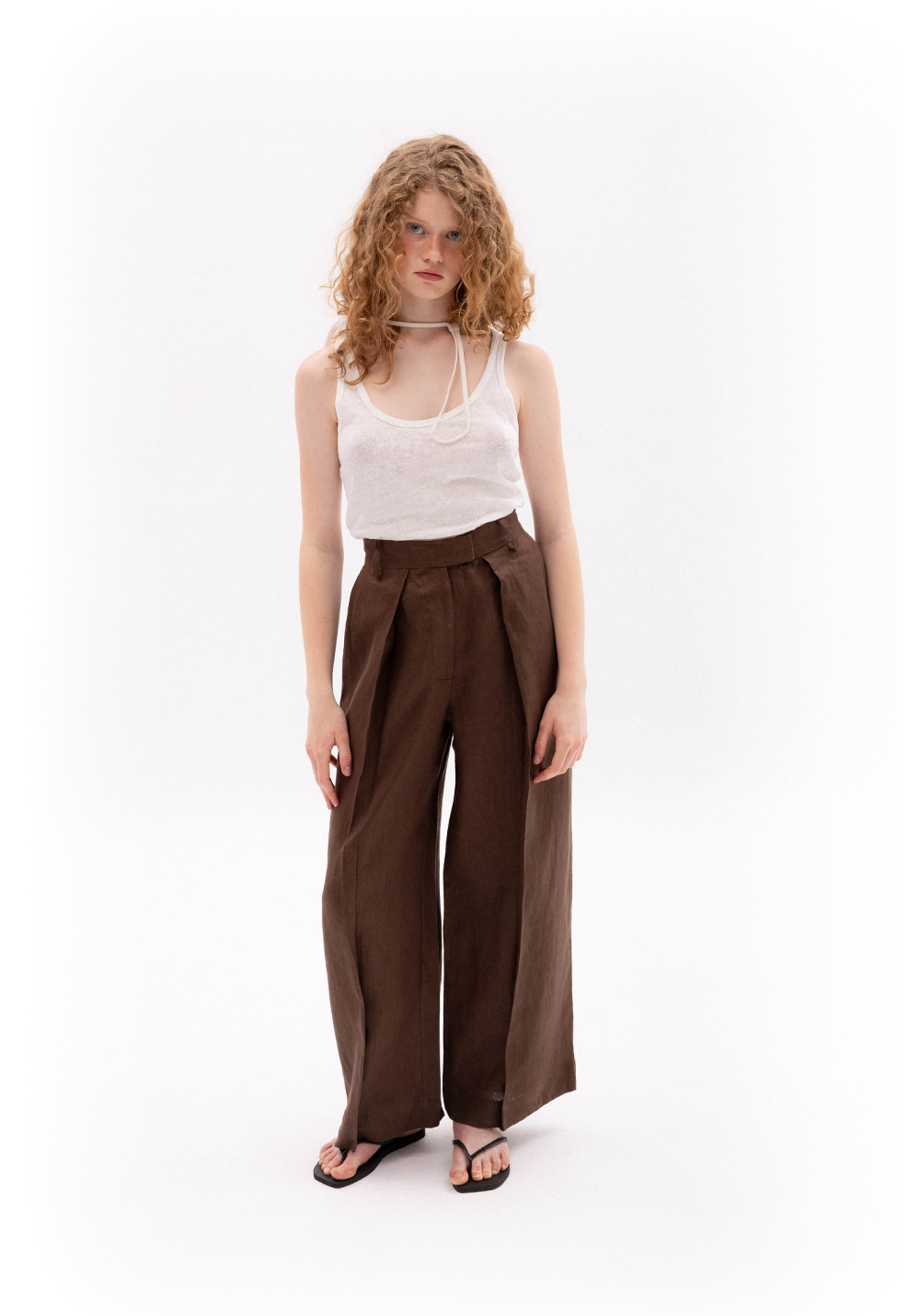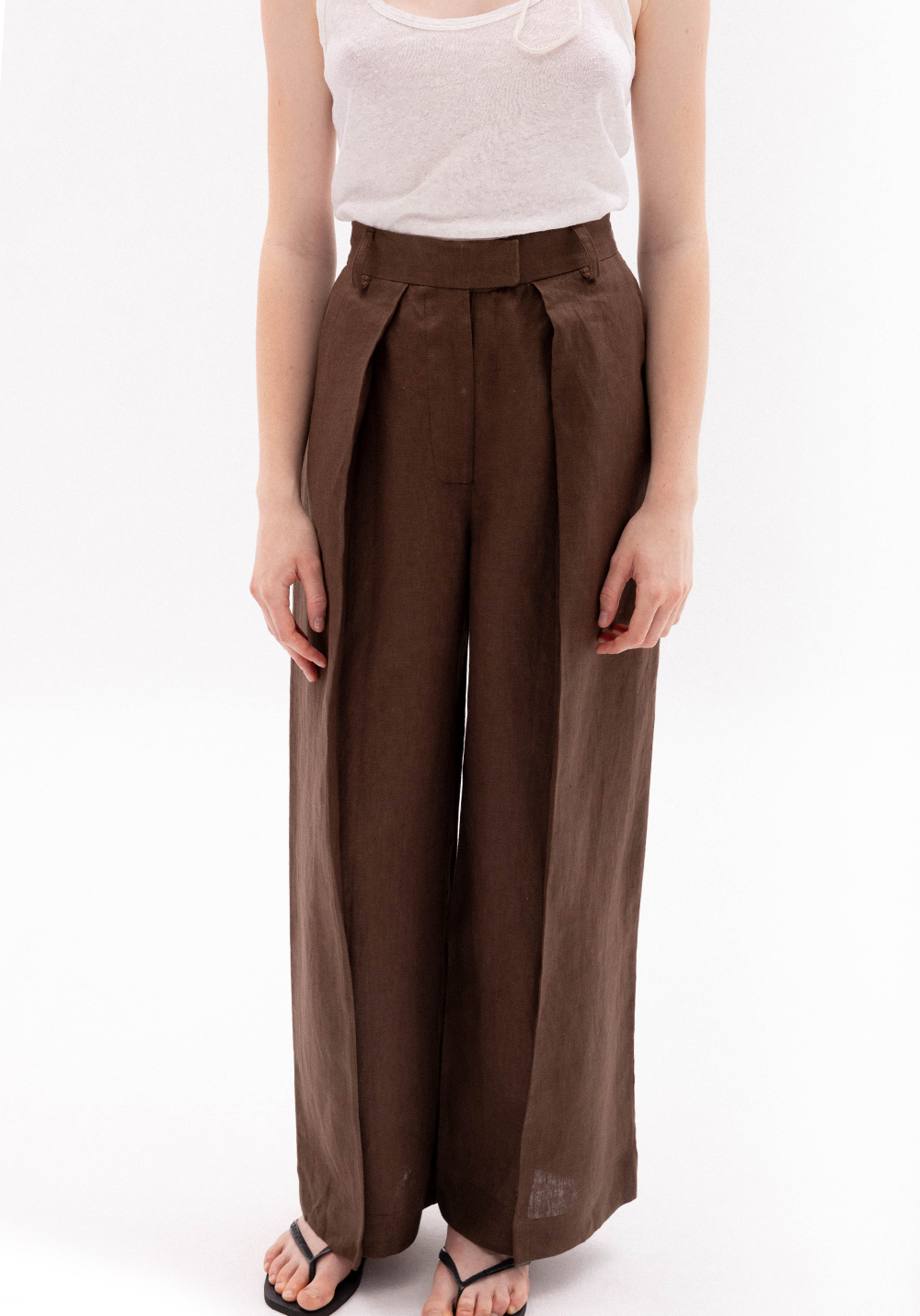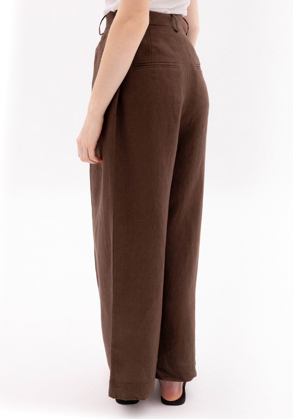 Брюки з глибокими складами коричневого кольору, вільного крою. Мають бокові та задні кишені, пояс зі шльковами. Виконані зі 100% щільного льону.