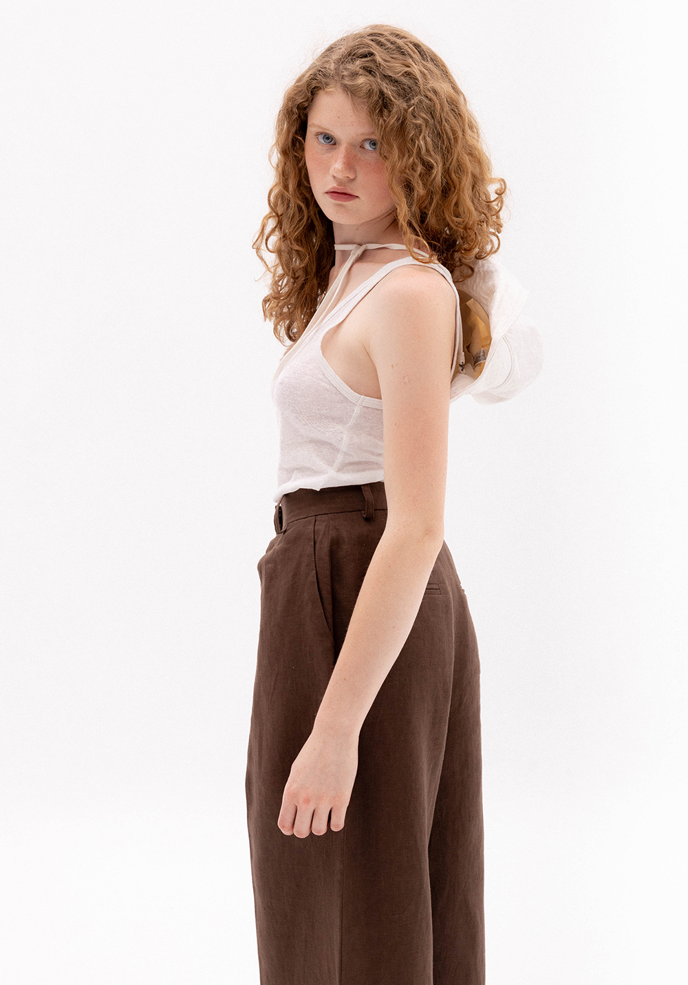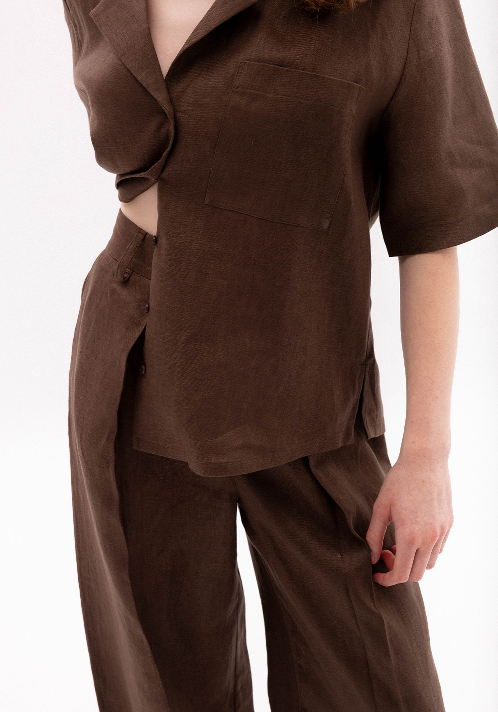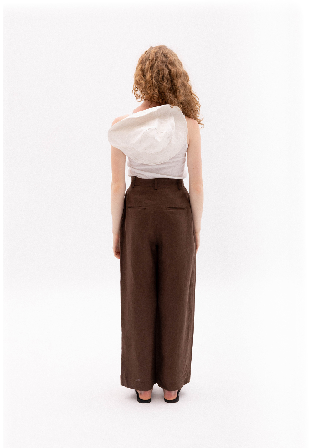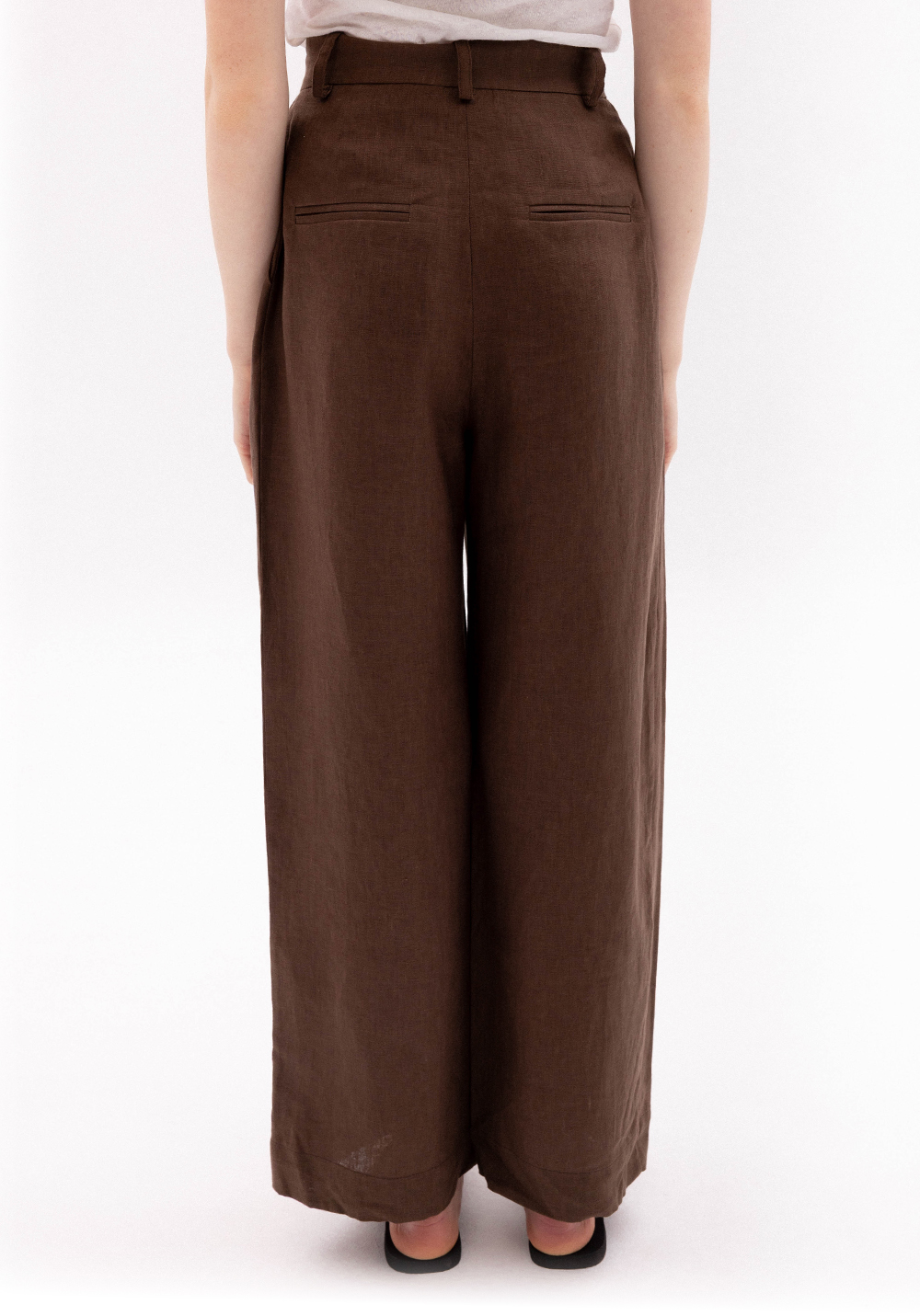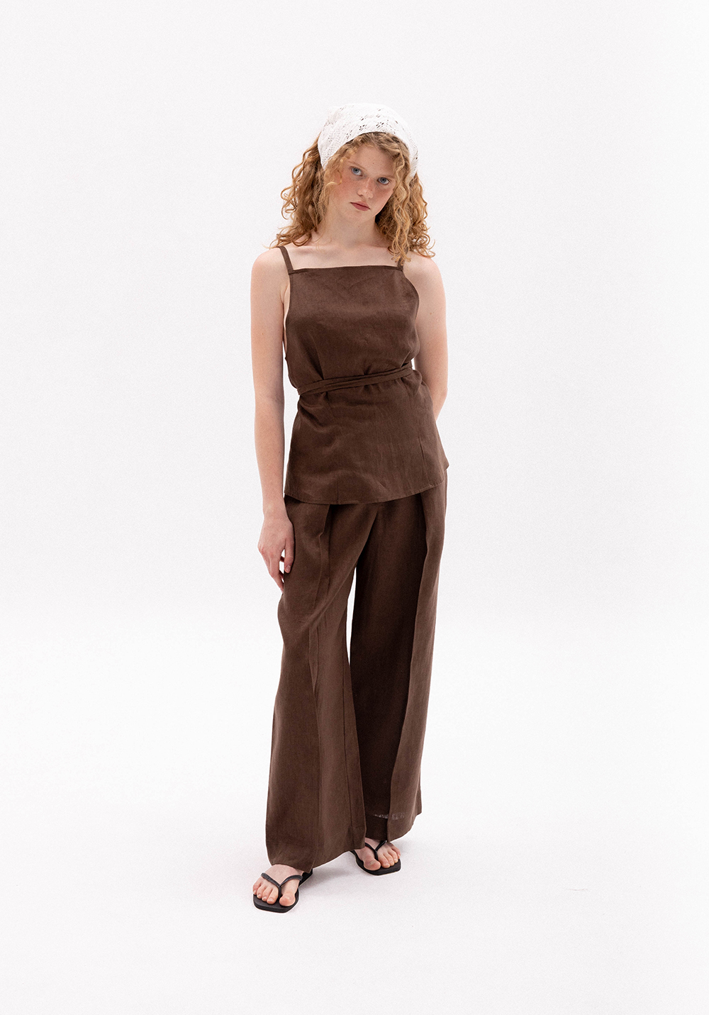 Брюки з глибокими складами коричневого кольору, вільного крою. Мають бокові та задні кишені, пояс зі шльковами. Виконані зі 100% щільного льону.
