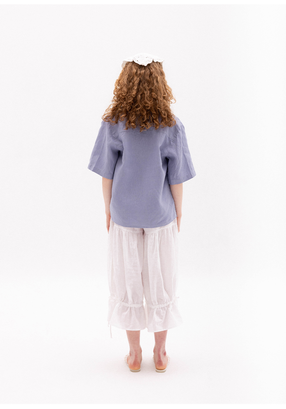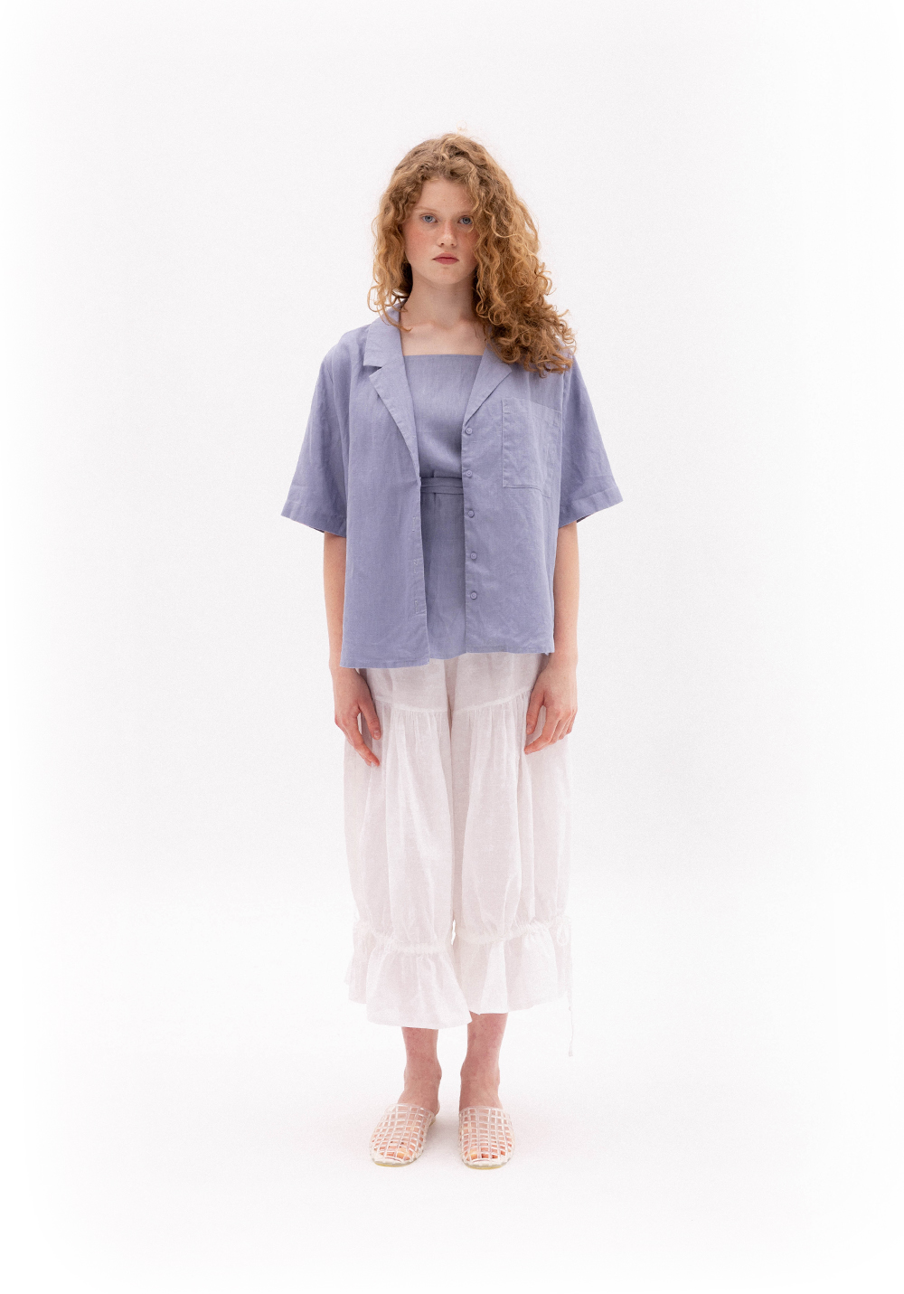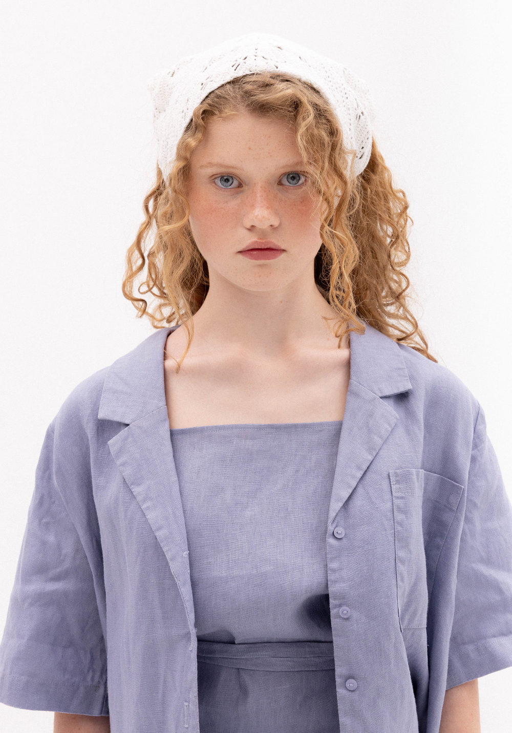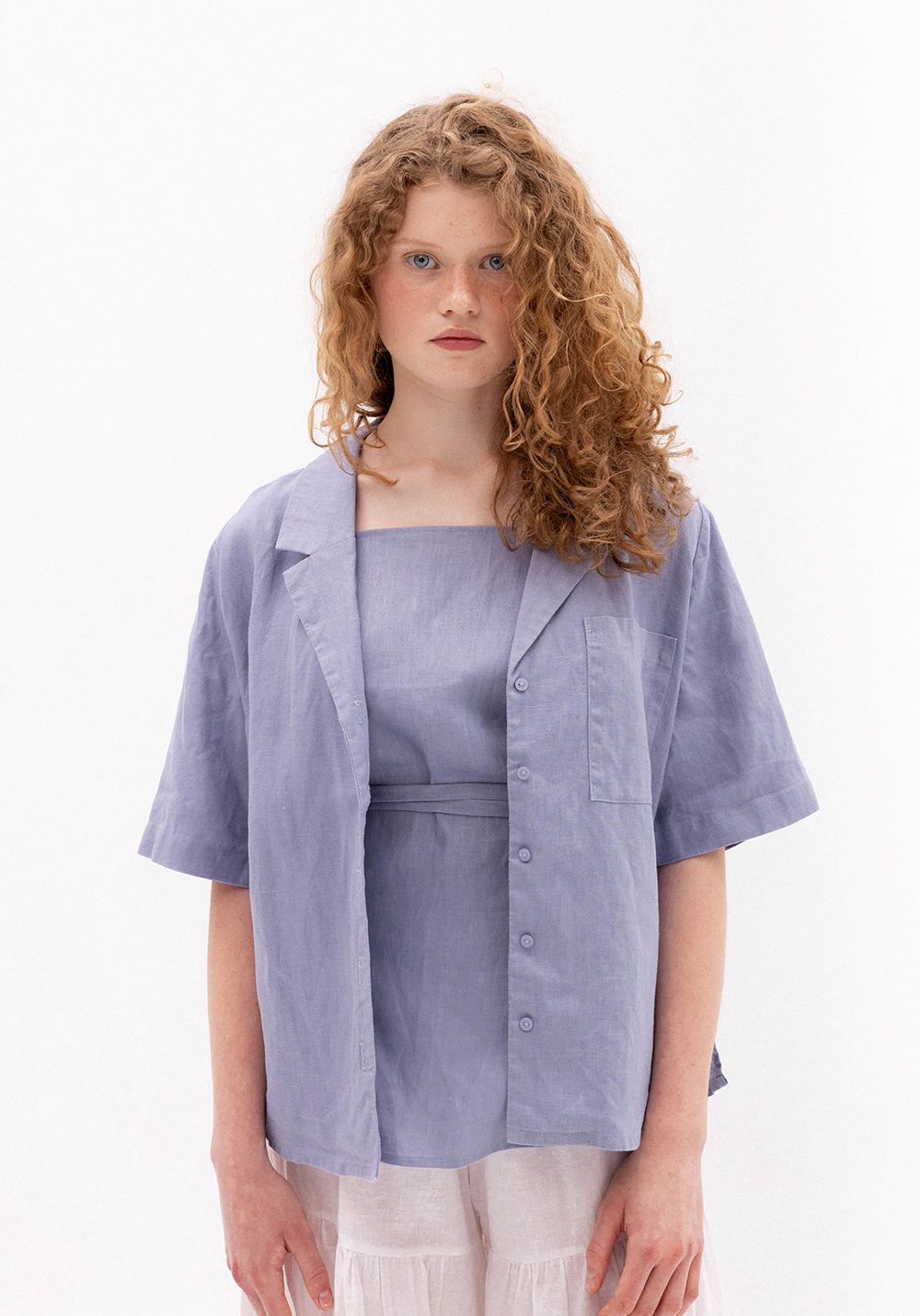 Сорочка волошкового кольору вільного крою. Модель має короткий рукав, застібається на гудзики та має кишеню. Виконана з 100% щільного льону.