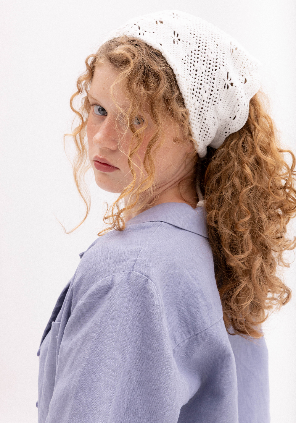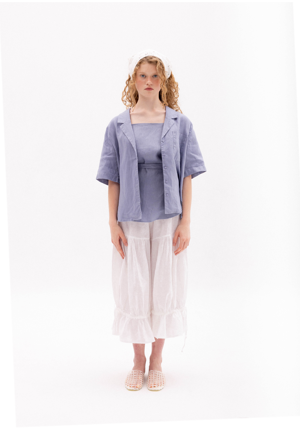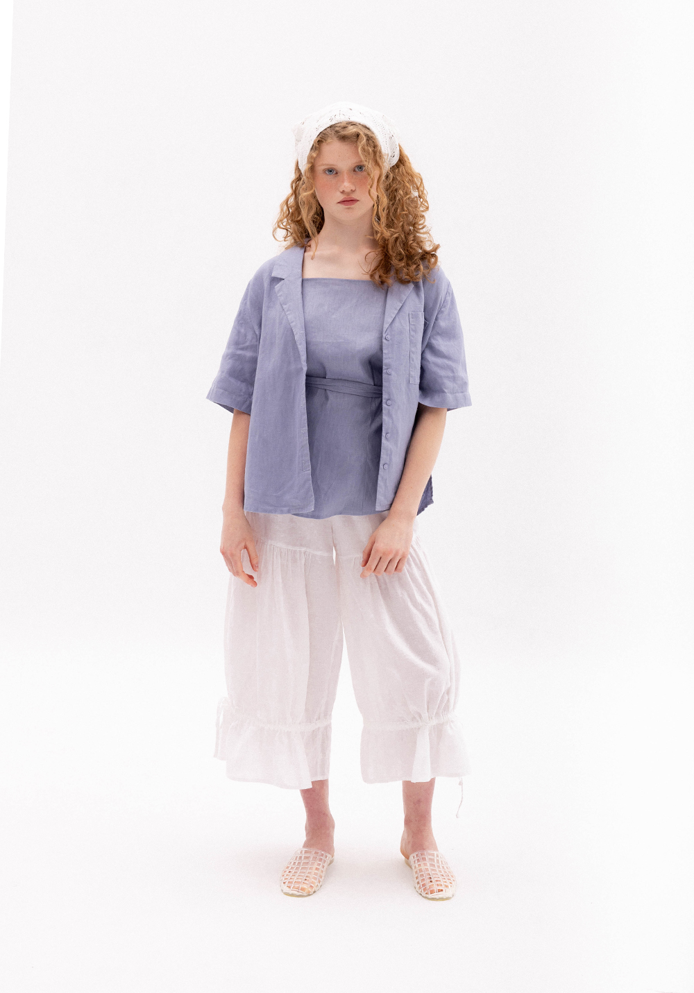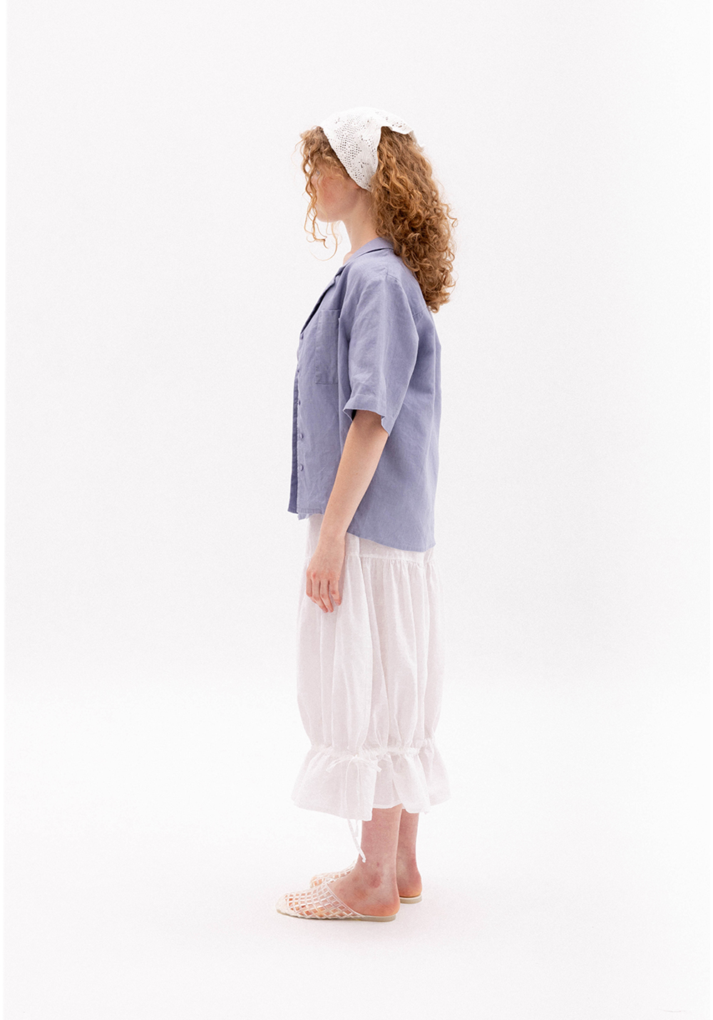 Сорочка волошкового кольору вільного крою. Модель має короткий рукав, застібається на гудзики та має кишеню. Виконана з 100% щільного льону.