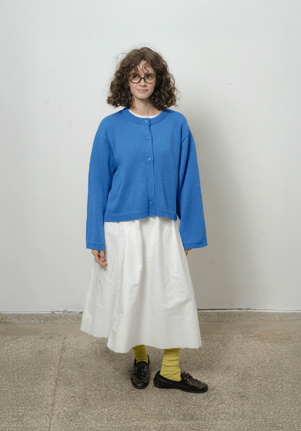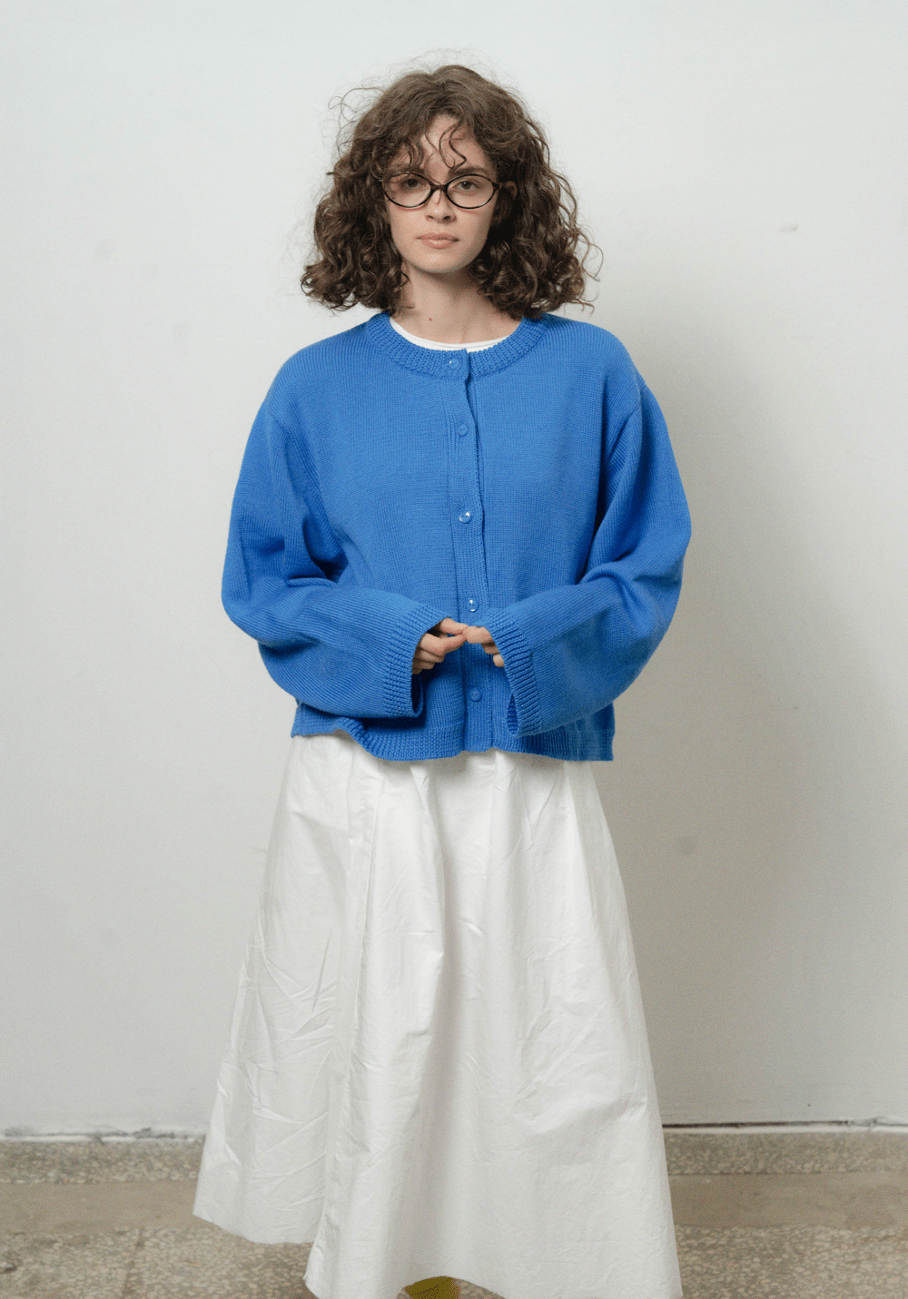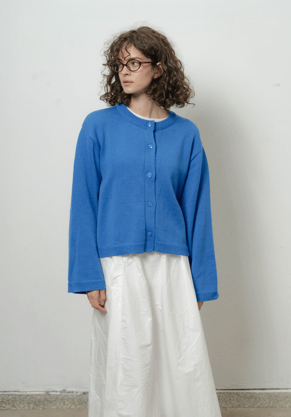 Оверсайз кардиган яскраво синього кольору з круглою горловиною. Виконаний з 100% вовни мериноса, має спущену лінію плеча та широкі рукави. Застібається на ґудзики спереду. Представлений у розмірі one-size.