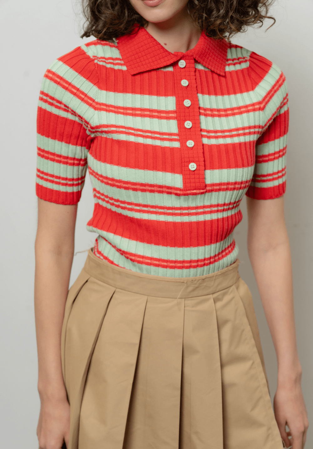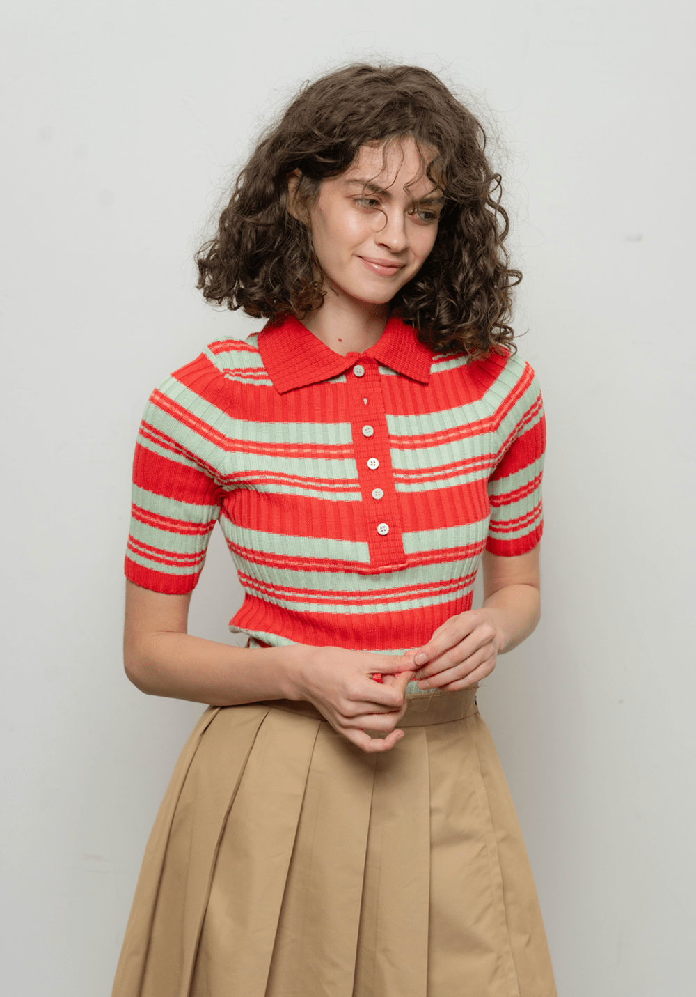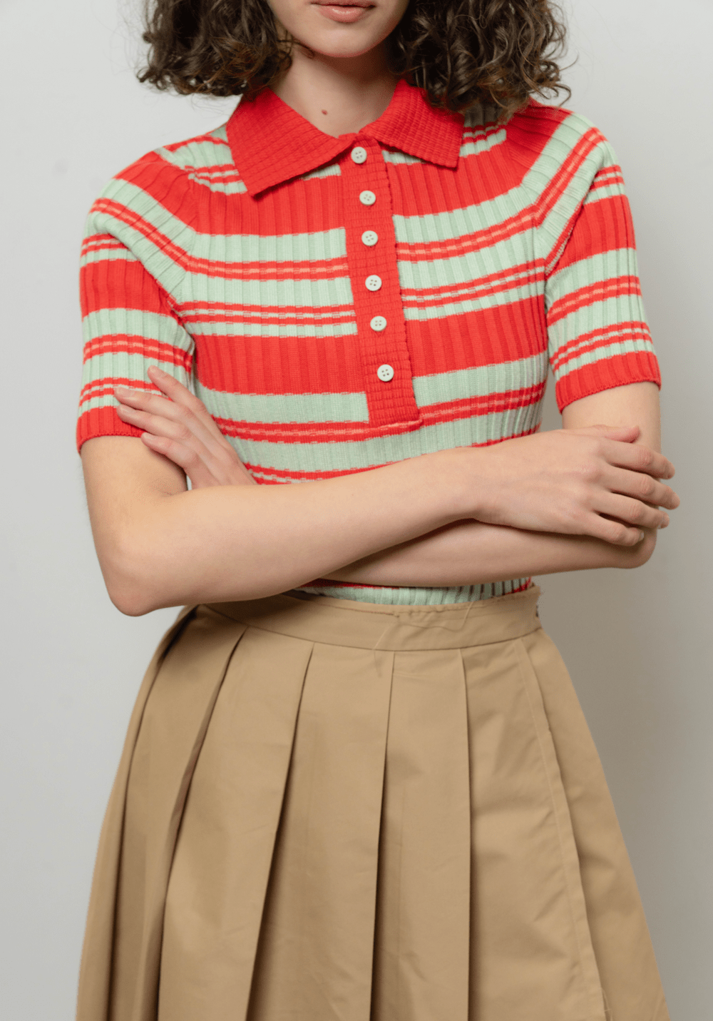 Яскраве приталене поло в рубчик з коротким рукавом. Модель з фактурною в’язкою, комірцем та застібкою на ґудзики.