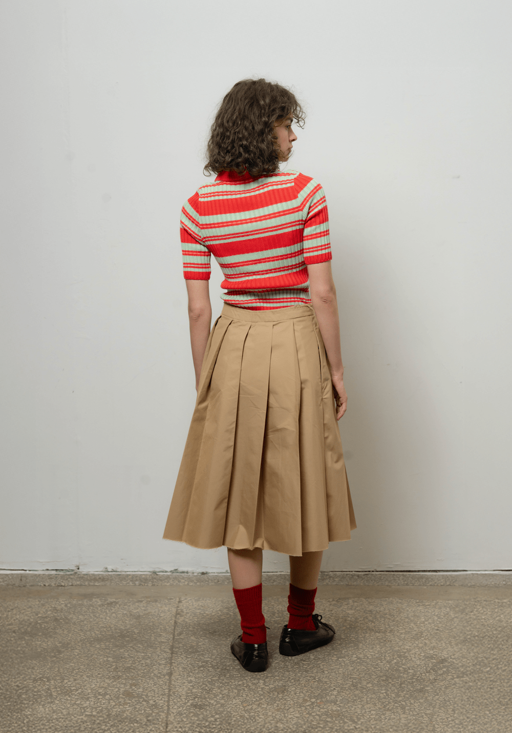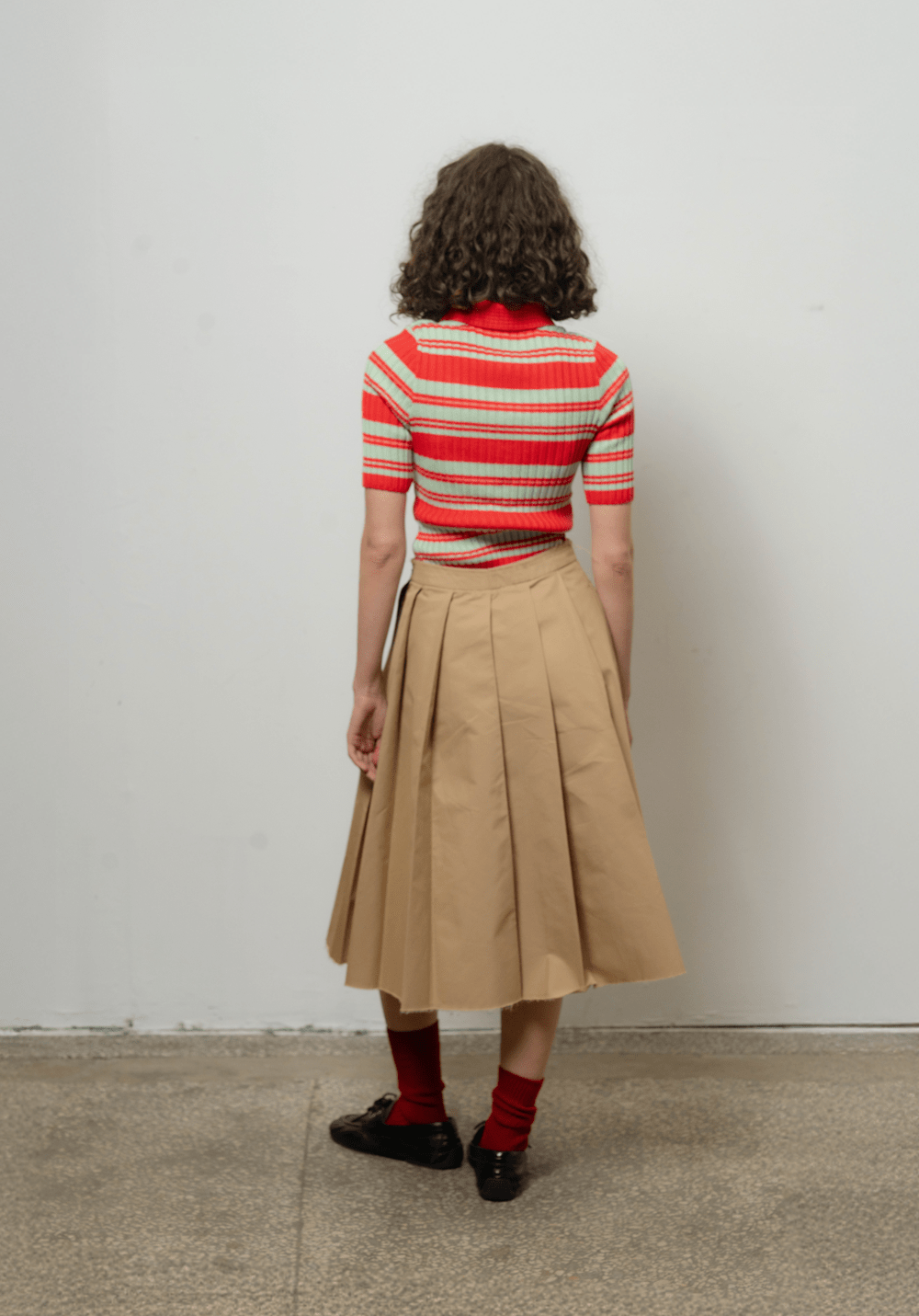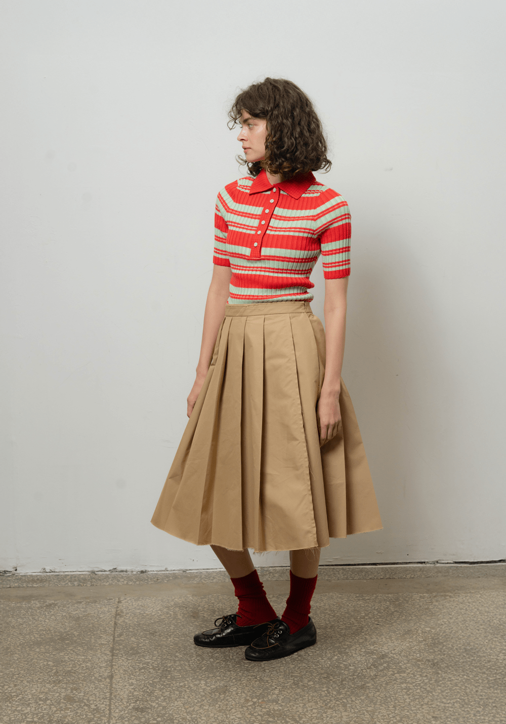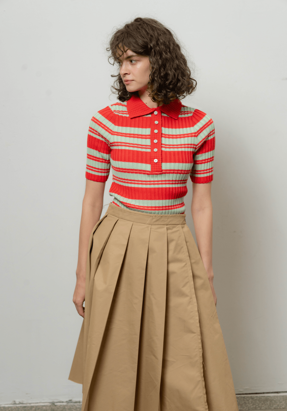 Яскраве приталене поло в рубчик з коротким рукавом. Модель з фактурною в’язкою, комірцем та застібкою на ґудзики.
