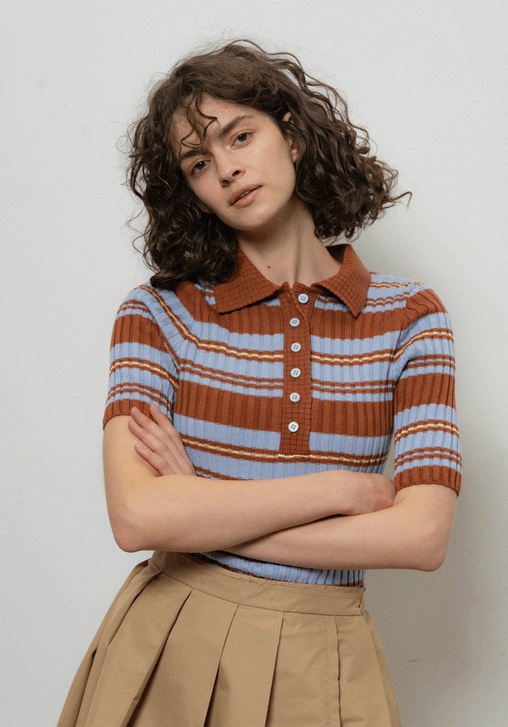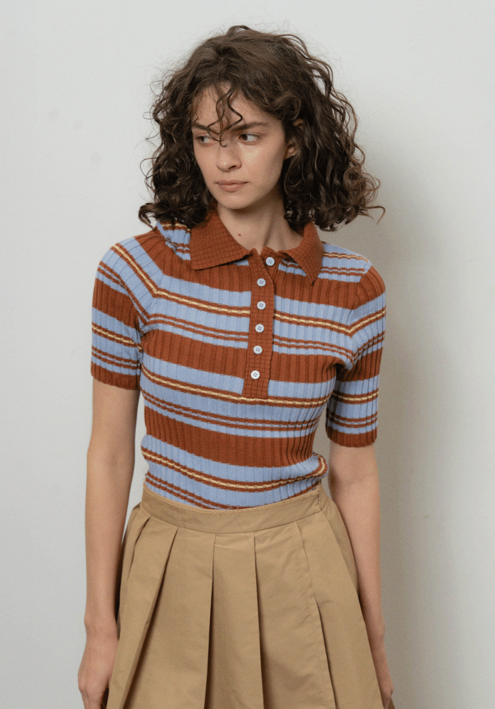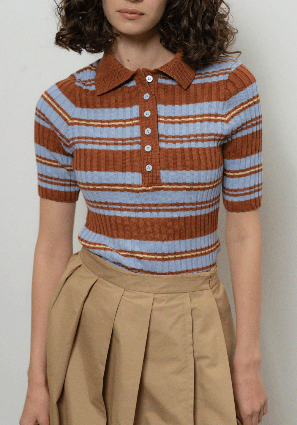 Яскраве приталене поло в рубчик з коротким рукавом. Модель з фактурною в’язкою, комірцем та застібкою на ґудзики.