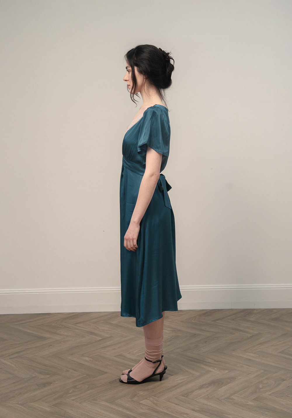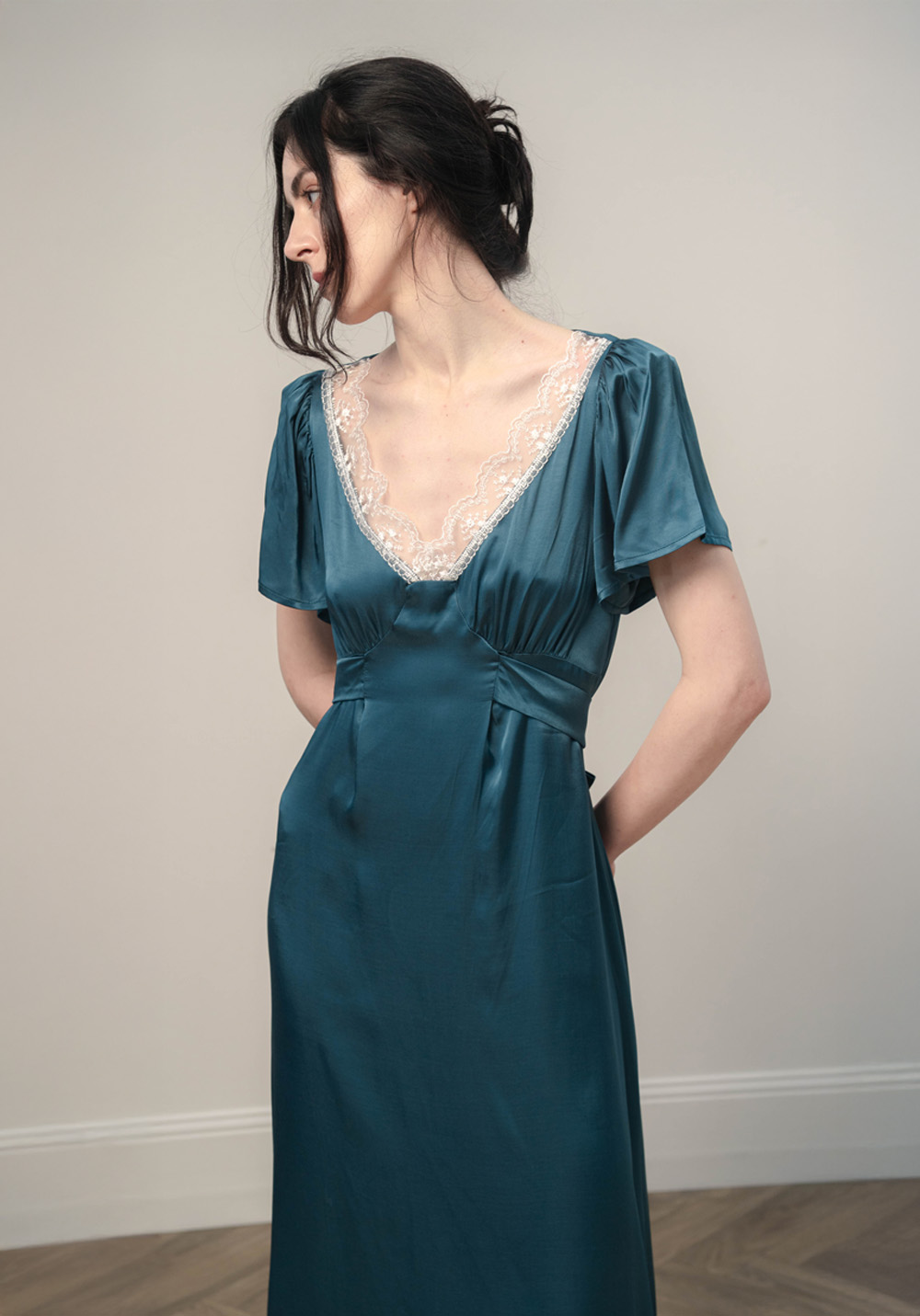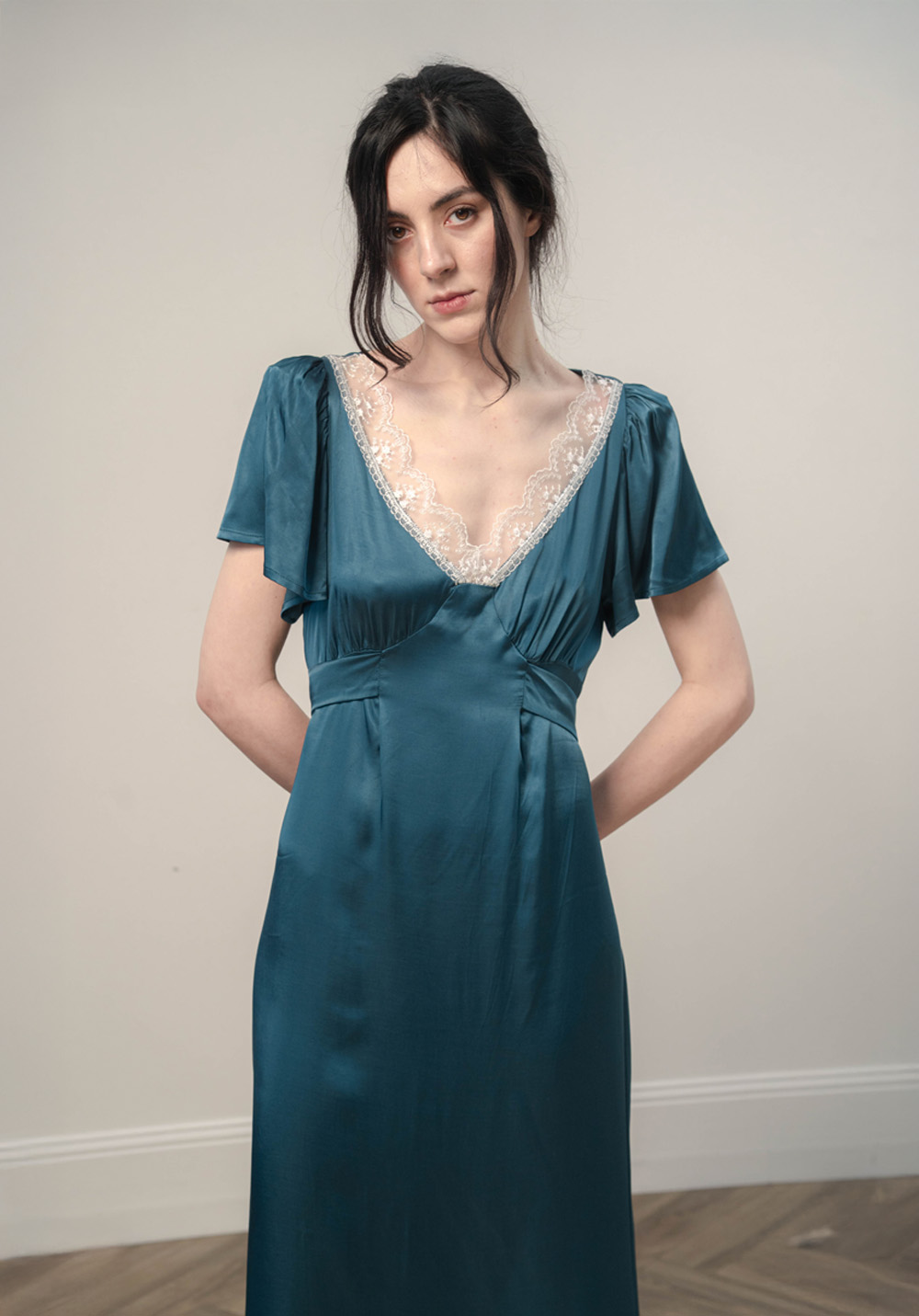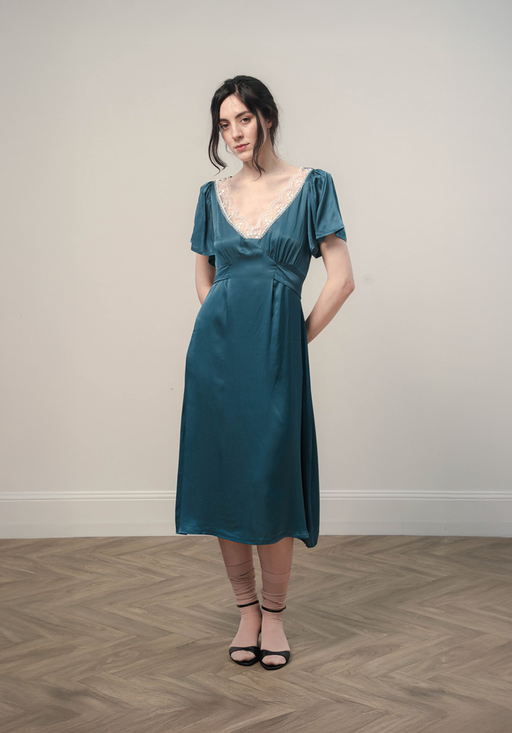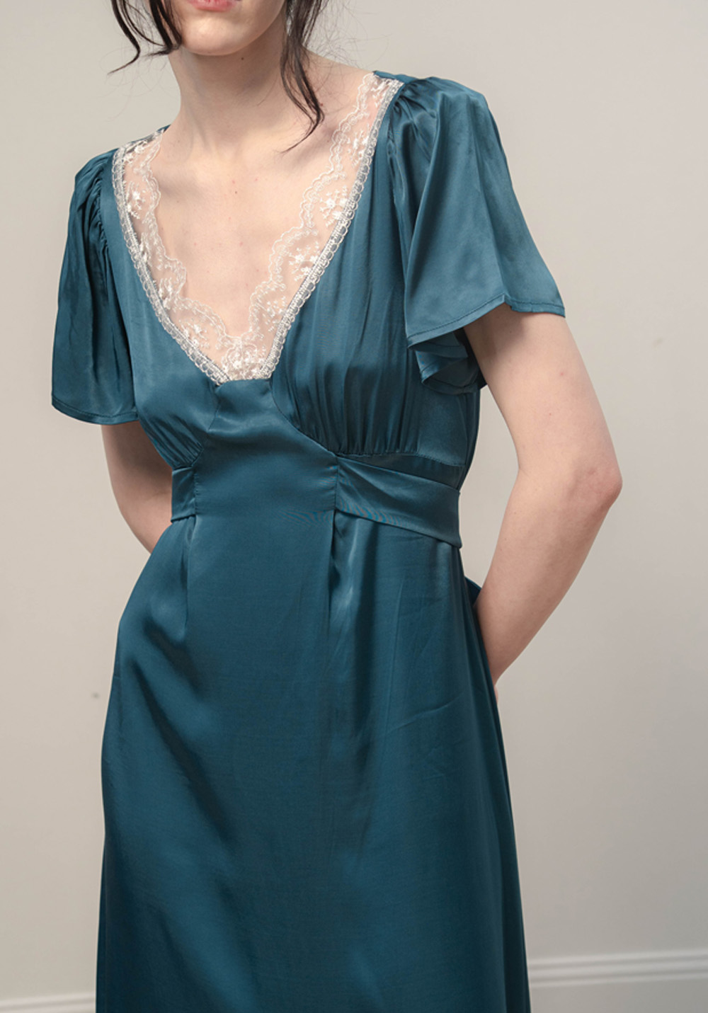 Сукня довжини міді з коротким рукавом і завищеною лінією талії. Виконана з віскозного сатину з гладкою поверхнею. V-подібний виріз оздоблений мереживом. Вільний крій по низу, м’яка посадка по фігурі. Підходить для щоденного носіння та подій.